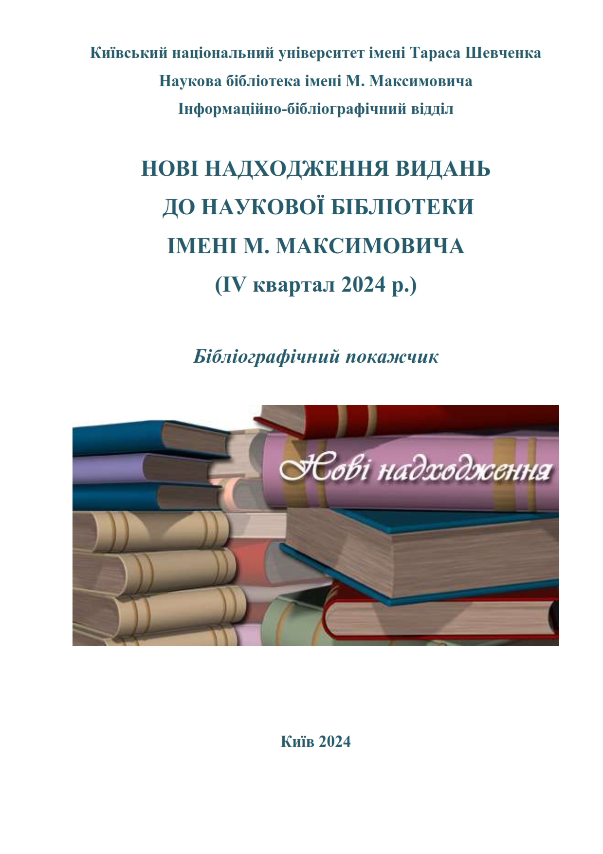 До відома користувачів! Співробітниками Інформаційно-бібліографічного відділу Наукової бібліотеки імені М. Максимовича упорядковано бібліографічний покажчик «Нові надходження видань до Наукової бібліотеки імені М. Максимовича» (IV квартал 2024 р.). У бібліографічному покажчику представлено документи, які надійшли до Наукової бібліотеки імені М. Максимовича в IV кварталі 2024 р. (жовтень – грудень 2024 р.). Покажчик містить 458 видань, систематизованих за 35 тематичними розділами відповідно до класифікатору УДК, зокрема: матеріали міжнародних науково-практичних конференцій, монографії, підручники, навчальні посібники, художня література українською, англійською та іншими іноземними мовами. Мета – поінформувати про нові надходження до бібліотеки, презентувати її інформаційні ресурси, ознайомити користувачів із сучасними виданнями, авторами, видавництвами, забезпечити ефективність використання книги і, головне, розкрити фонди та привернути увагу до читання, сприяти активнішому відвідуванню сайта бібліотеки. Мобільний та змістовний огляд нових надходжень є провідником у потоці інформації, це послідовна розповідь про твори друку та інші інформаційні носії, які є найбільш дієвою і популярною формою пропаганди літератури. Інформація буде корисною фахівцям різних галузей знань, викладачам, аспірантам, студентам, абітурієнтам тощо.